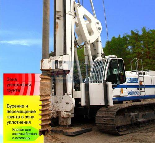 Набивные сваи в раскатанных скважинах удачно сочетают в себе преимущества забивных и буронабивных свай. При раскатке скважин грунт не выбуривается на поверхность, а вкатывается в окружающий скважину массив, формируя уплотненную зону. За счет формирования уплотненной зоны и вовлечения в работу грунта околосвайного пространства несущая способность набивных свай в раскатанных скважинах превышает несущую способность буронабивной сваи аналогичного сечения и длины в 3-5 раз и практически соответствует несущей способности забивной висячей сваи, равной длины и сечения.